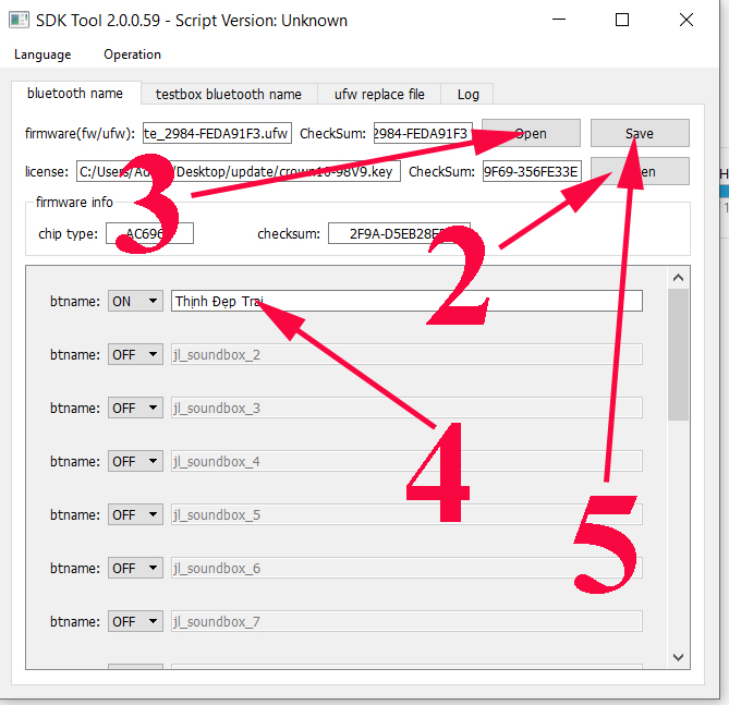 Bước 2: Nhấn vào open ở dòng license và mở file .key được cấp (file này không có sẵn, các bạn phải inbox zalo 0975.581.779 kèm ảnh chụp sản phẩm thực tế và nhắn tin với nội dung: XIN KEY để đổi tên bluetooth)